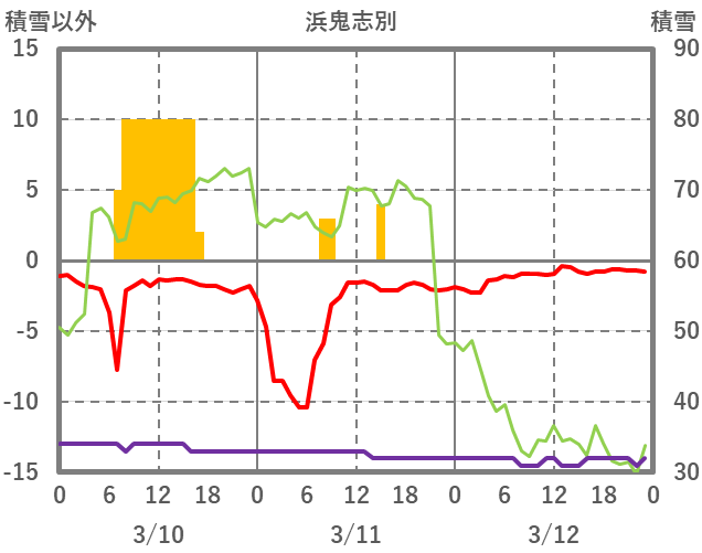 | 日 | 時 | 気温 | 降水 | 風向/風速 | 日照 | 積雪 | 降雪 |