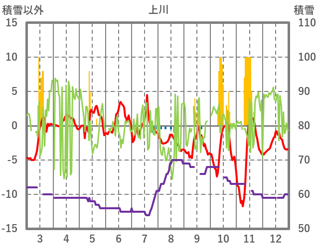 | 日 | 時 | 気温 | 降水 | 風向/風速 | 日照 | 積雪 | 降雪 |