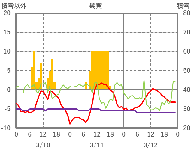 | 日 | 時 | 気温 | 降水 | 風向/風速 | 日照 | 積雪 | 降雪 |