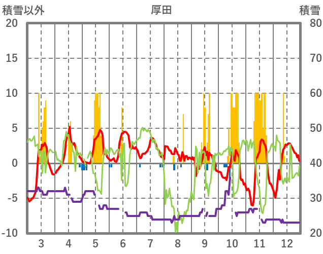 | 日 | 時 | 気温 | 降水 | 風向/風速 | 日照 | 積雪 | 降雪 |