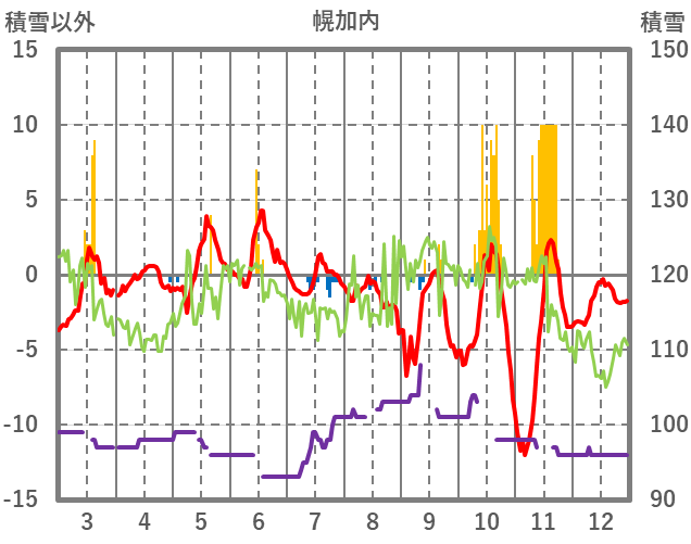 | 日 | 時 | 気温 | 降水 | 風向/風速 | 日照 | 積雪 | 降雪 |