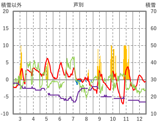| 日 | 時 | 気温 | 降水 | 風向/風速 | 日照 | 積雪 | 降雪 |