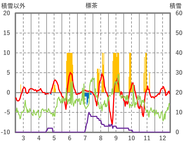 | 日 | 時 | 気温 | 降水 | 風向/風速 | 日照 | 積雪 | 降雪 |
