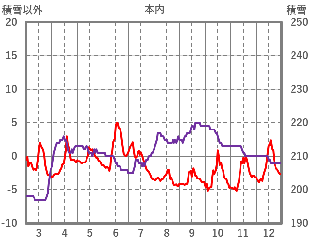 | 日 | 時 | 気温 | 降水 | 風向/風速 | 日照 | 積雪 | 降雪 |