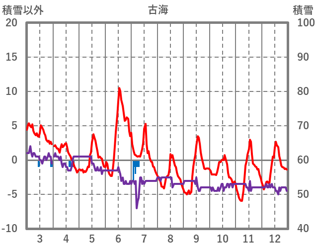 | 日 | 時 | 気温 | 降水 | 風向/風速 | 日照 | 積雪 | 降雪 |