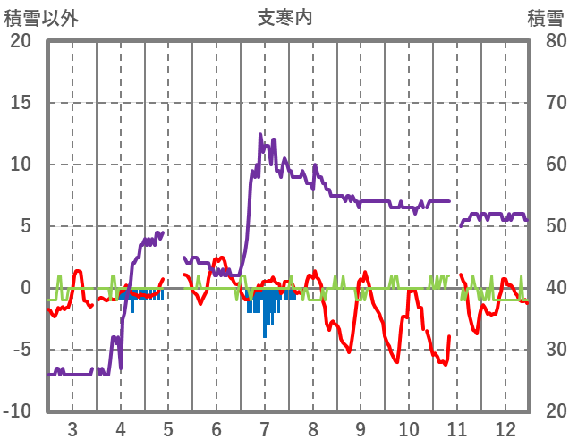 | 日 | 時 | 気温 | 降水 | 風向/風速 | 日照 | 積雪 | 降雪 |