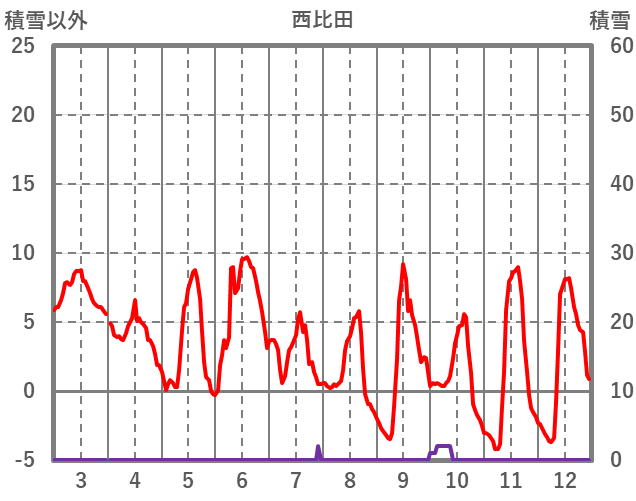 | 日 | 時 | 気温 | 降水 | 風向/風速 | 日照 | 積雪 | 降雪 |
