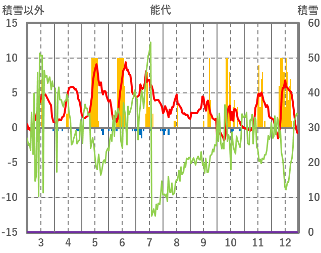 | 日 | 時 | 気温 | 降水 | 風向/風速 | 日照 | 積雪 | 降雪 |