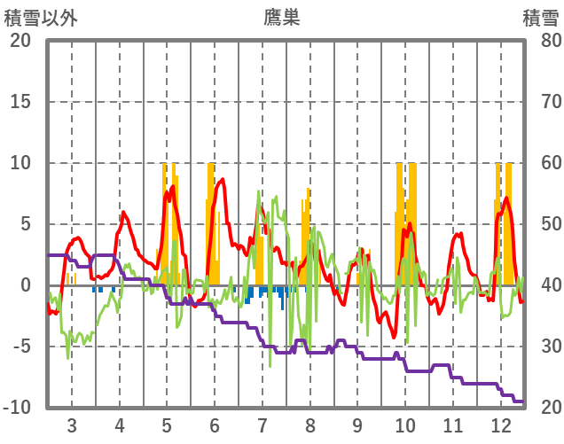| 日 | 時 | 気温 | 降水 | 風向/風速 | 日照 | 積雪 | 降雪 |