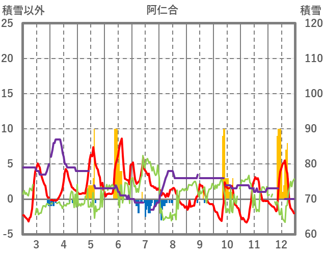 | 日 | 時 | 気温 | 降水 | 風向/風速 | 日照 | 積雪 | 降雪 |
