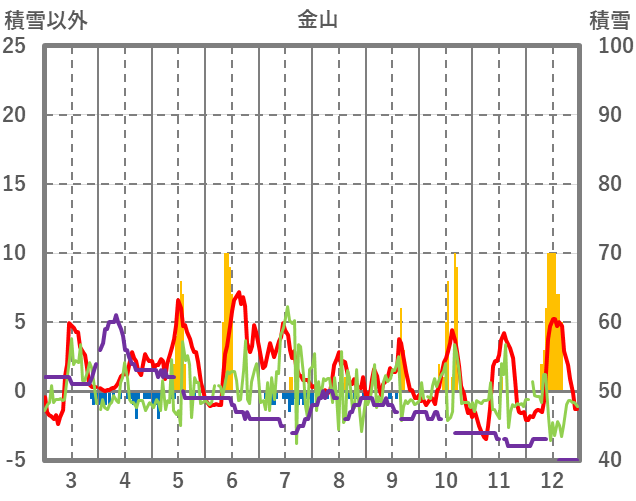 | 日 | 時 | 気温 | 降水 | 風向/風速 | 日照 | 積雪 | 降雪 |