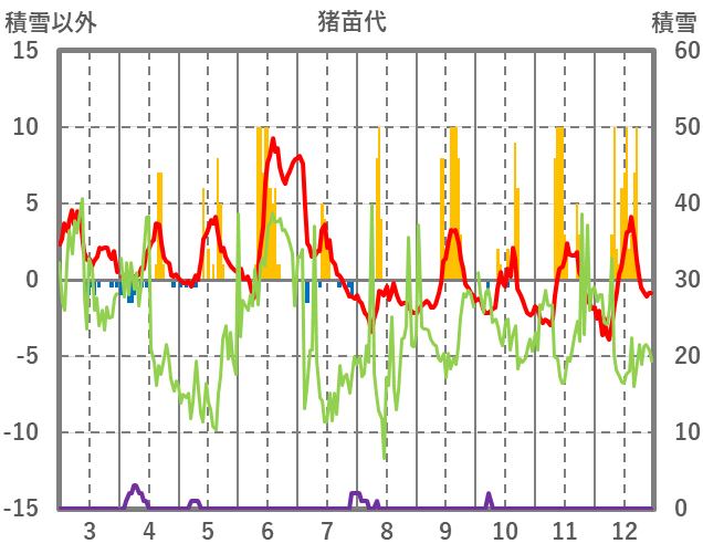 | 日 | 時 | 気温 | 降水 | 風向/風速 | 日照 | 積雪 | 降雪 |