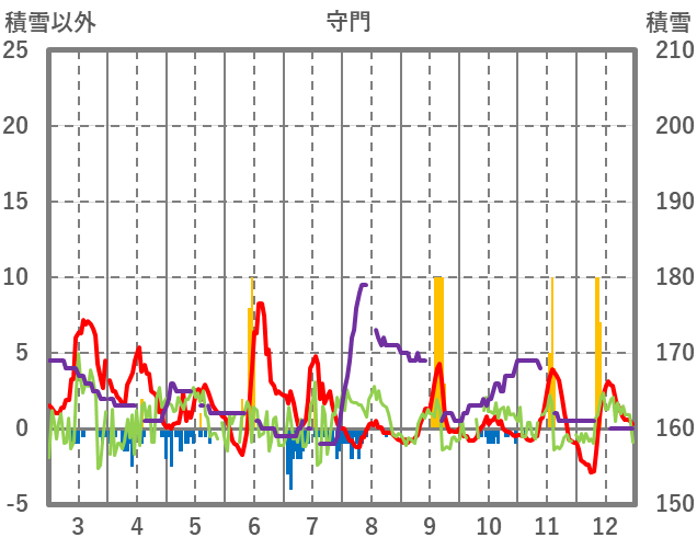 | 日 | 時 | 気温 | 降水 | 風向/風速 | 日照 | 積雪 | 降雪 |