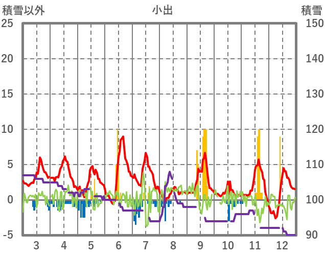 | 日 | 時 | 気温 | 降水 | 風向/風速 | 日照 | 積雪 | 降雪 |