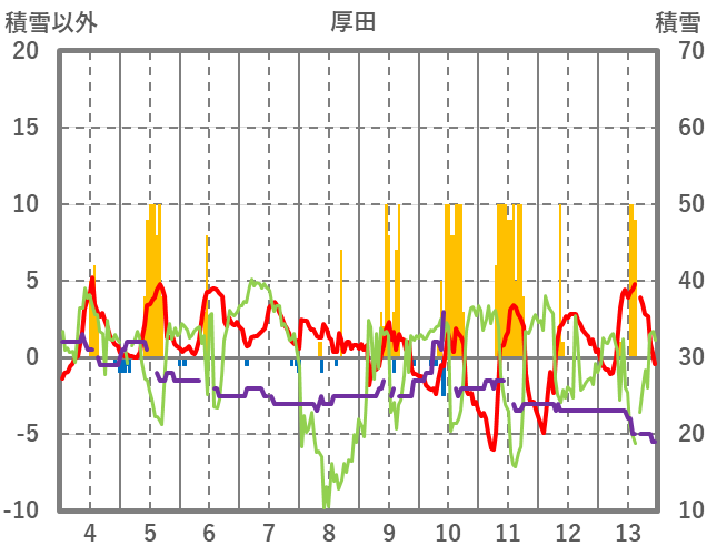 | 日 | 時 | 気温 | 降水 | 風向/風速 | 日照 | 積雪 | 降雪 |