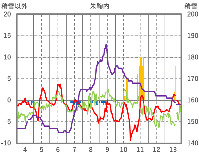 | 日 | 時 | 気温 | 降水 | 風向/風速 | 日照 | 積雪 | 降雪 |
