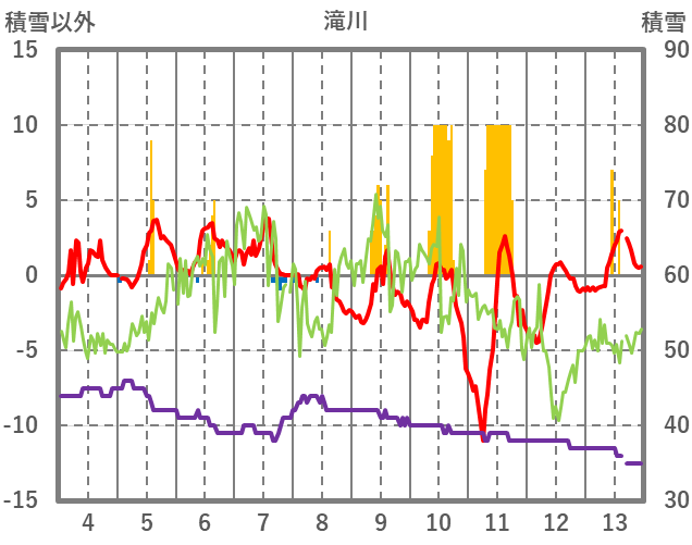 | 日 | 時 | 気温 | 降水 | 風向/風速 | 日照 | 積雪 | 降雪 |