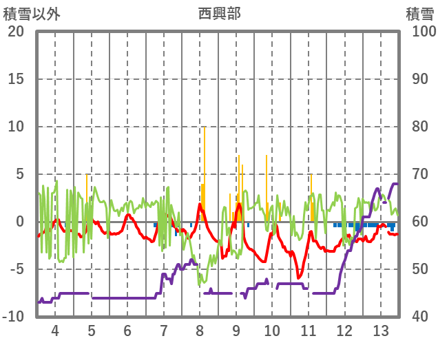| 日 | 時 | 気温 | 降水 | 風向/風速 | 日照 | 積雪 | 降雪 |