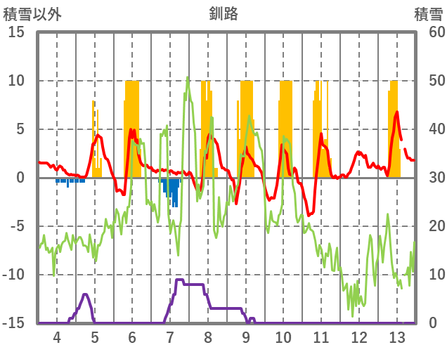 | 日 | 時 | 気温 | 降水 | 風向/風速 | 日照 | 積雪 | 降雪 |