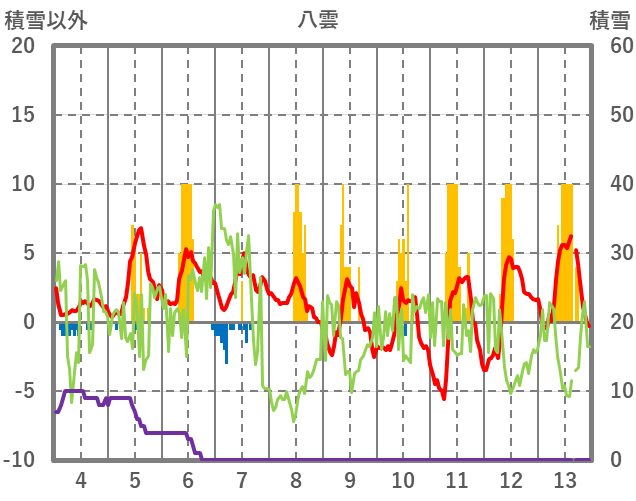 | 日 | 時 | 気温 | 降水 | 風向/風速 | 日照 | 積雪 | 降雪 |