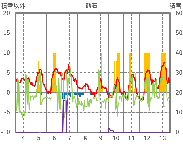 | 日 | 時 | 気温 | 降水 | 風向/風速 | 日照 | 積雪 | 降雪 |