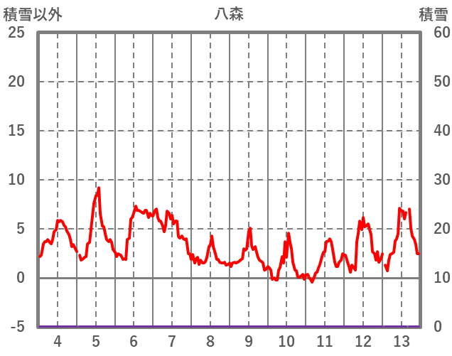 | 日 | 時 | 気温 | 降水 | 風向/風速 | 日照 | 積雪 | 降雪 |