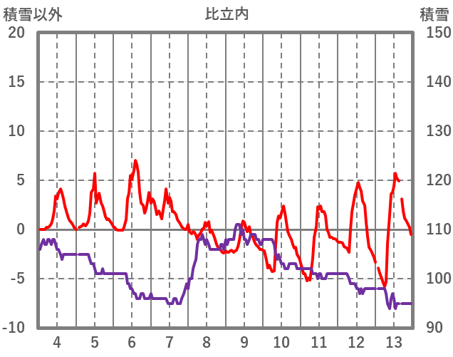 | 日 | 時 | 気温 | 降水 | 風向/風速 | 日照 | 積雪 | 降雪 |