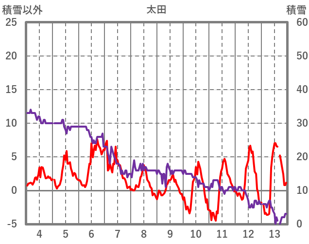 | 日 | 時 | 気温 | 降水 | 風向/風速 | 日照 | 積雪 | 降雪 |