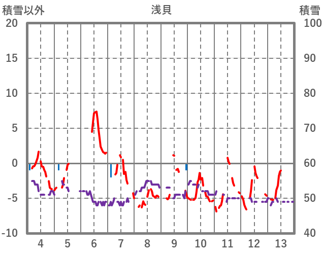 | 日 | 時 | 気温 | 降水 | 風向/風速 | 日照 | 積雪 | 降雪 |