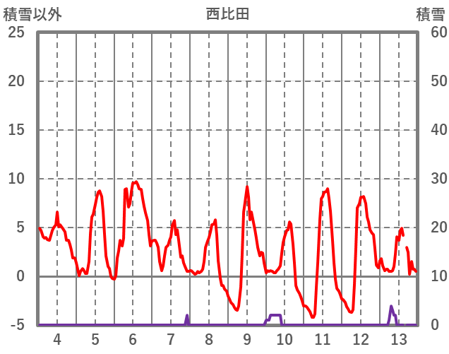 | 日 | 時 | 気温 | 降水 | 風向/風速 | 日照 | 積雪 | 降雪 |