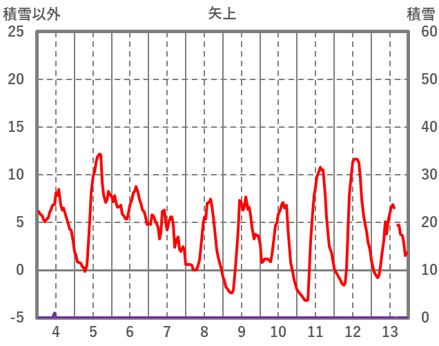 | 日 | 時 | 気温 | 降水 | 風向/風速 | 日照 | 積雪 | 降雪 |