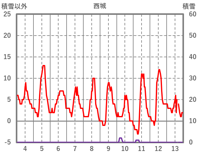 | 日 | 時 | 気温 | 降水 | 風向/風速 | 日照 | 積雪 | 降雪 |