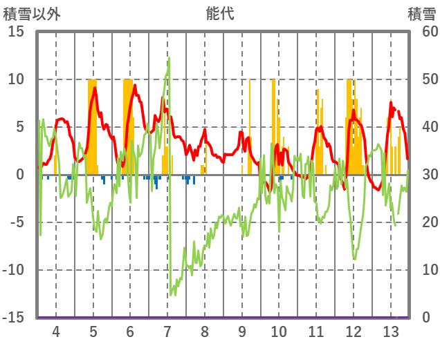| 日 | 時 | 気温 | 降水 | 風向/風速 | 日照 | 積雪 | 降雪 |