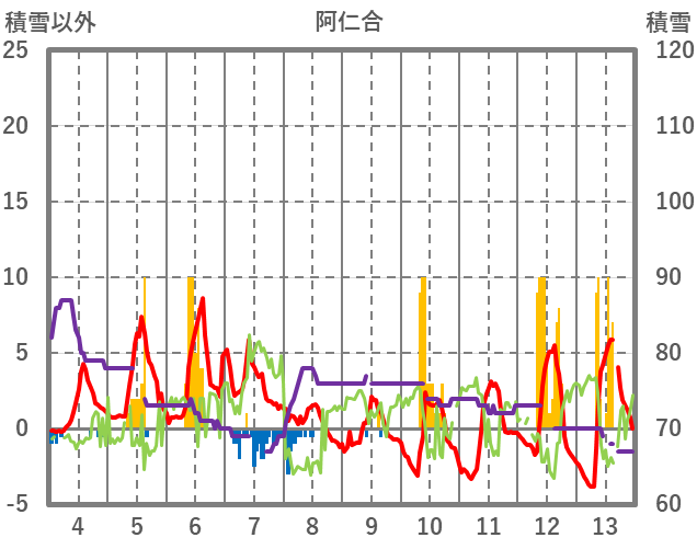 | 日 | 時 | 気温 | 降水 | 風向/風速 | 日照 | 積雪 | 降雪 |