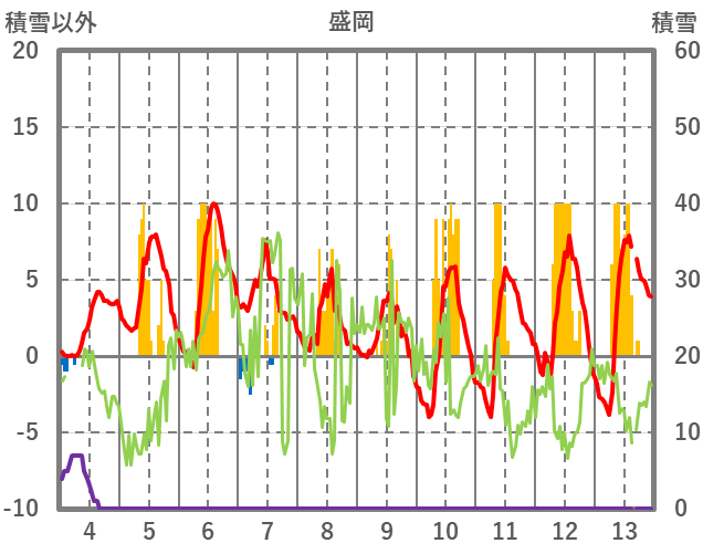| 日 | 時 | 気温 | 降水 | 風向/風速 | 日照 | 積雪 | 降雪 |