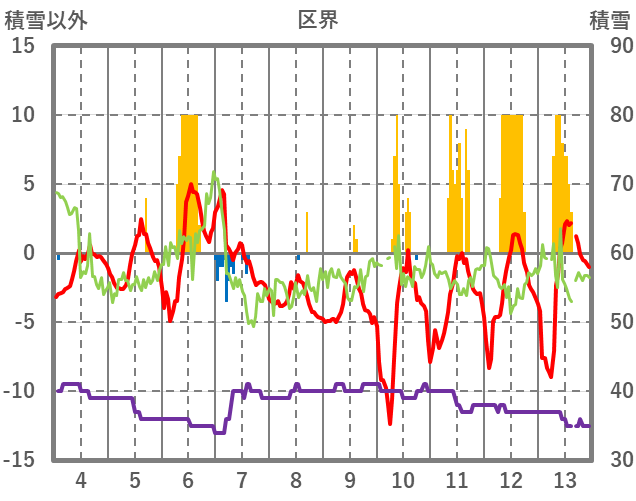 | 日 | 時 | 気温 | 降水 | 風向/風速 | 日照 | 積雪 | 降雪 |