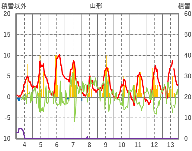 | 日 | 時 | 気温 | 降水 | 風向/風速 | 日照 | 積雪 | 降雪 |