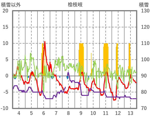 | 日 | 時 | 気温 | 降水 | 風向/風速 | 日照 | 積雪 | 降雪 |