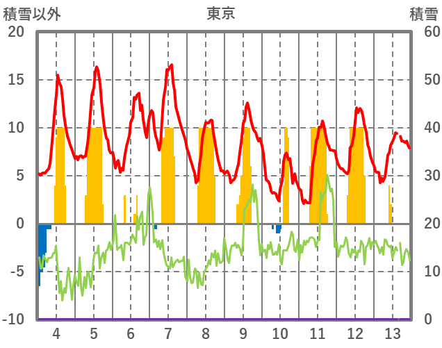 | 日 | 時 | 気温 | 降水 | 風向/風速 | 日照 | 積雪 | 降雪 |