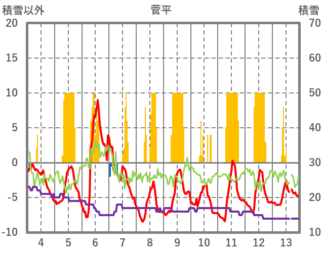 | 日 | 時 | 気温 | 降水 | 風向/風速 | 日照 | 積雪 | 降雪 |