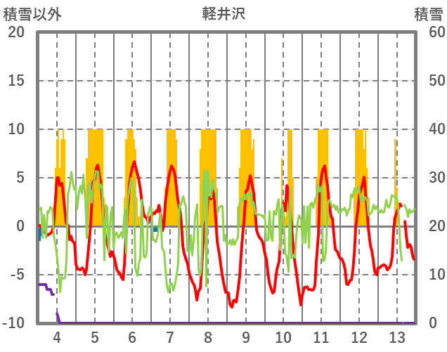 | 日 | 時 | 気温 | 降水 | 風向/風速 | 日照 | 積雪 | 降雪 |