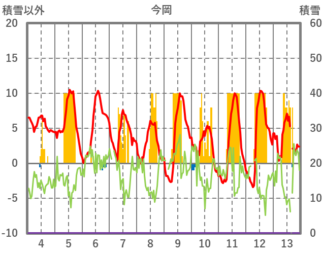 | 日 | 時 | 気温 | 降水 | 風向/風速 | 日照 | 積雪 | 降雪 |