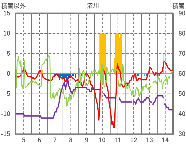 | 日 | 時 | 気温 | 降水 | 風向/風速 | 日照 | 積雪 | 降雪 |