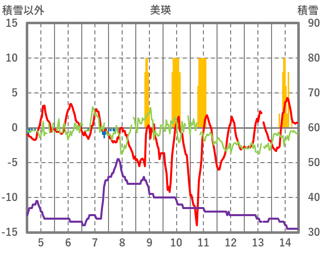 | 日 | 時 | 気温 | 降水 | 風向/風速 | 日照 | 積雪 | 降雪 |