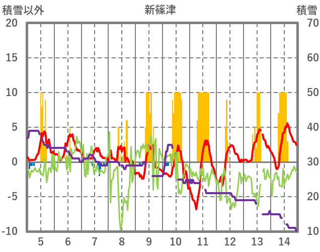 | 日 | 時 | 気温 | 降水 | 風向/風速 | 日照 | 積雪 | 降雪 |