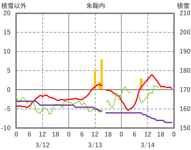 | 日 | 時 | 気温 | 降水 | 風向/風速 | 日照 | 積雪 | 降雪 |
