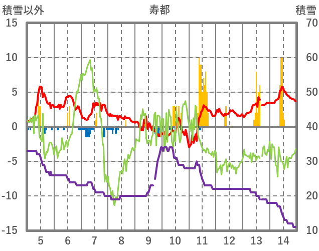 | 日 | 時 | 気温 | 降水 | 風向/風速 | 日照 | 積雪 | 降雪 |