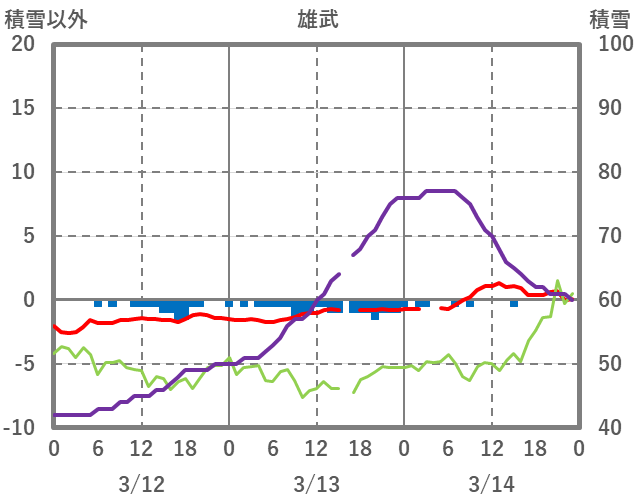 | 日 | 時 | 気温 | 降水 | 風向/風速 | 日照 | 積雪 | 降雪 |