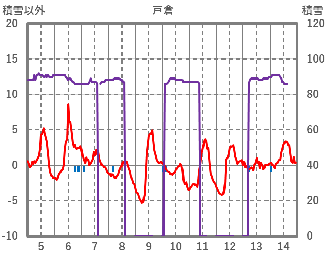 | 日 | 時 | 気温 | 降水 | 風向/風速 | 日照 | 積雪 | 降雪 |