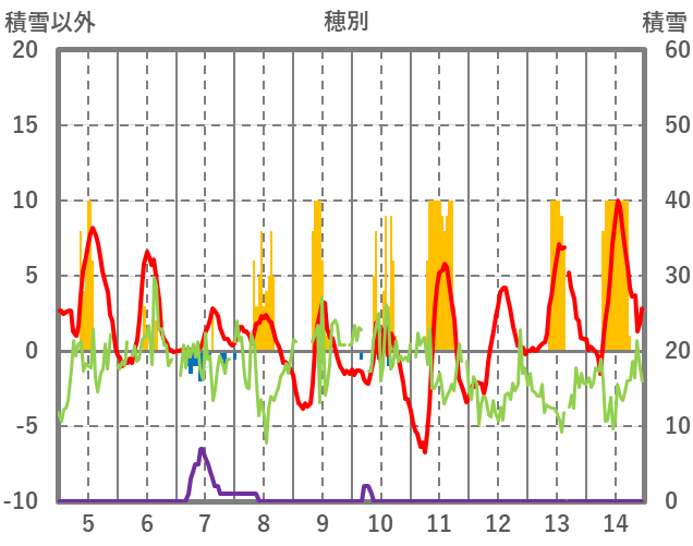 | 日 | 時 | 気温 | 降水 | 風向/風速 | 日照 | 積雪 | 降雪 |